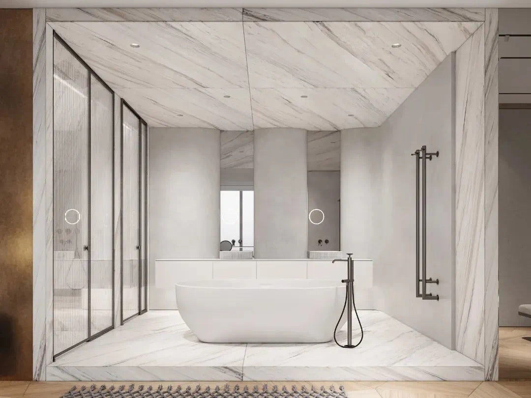- Kitchen and Bathroom Countertops: Volkas Marble is an excellent choice for kitchen and bathroom countertops. Its durability, easy maintenance, and strong dimensional layering make it long-lasting and resistant to discoloration. The white base color creates a fresh and bright atmosphere in the kitchen and bathroom, while the grey veining adds a touch of elegance and personality. Enjoying the pleasure of cooking or bathing in such an elegant environment every day undoubtedly brings joy and satisfaction.