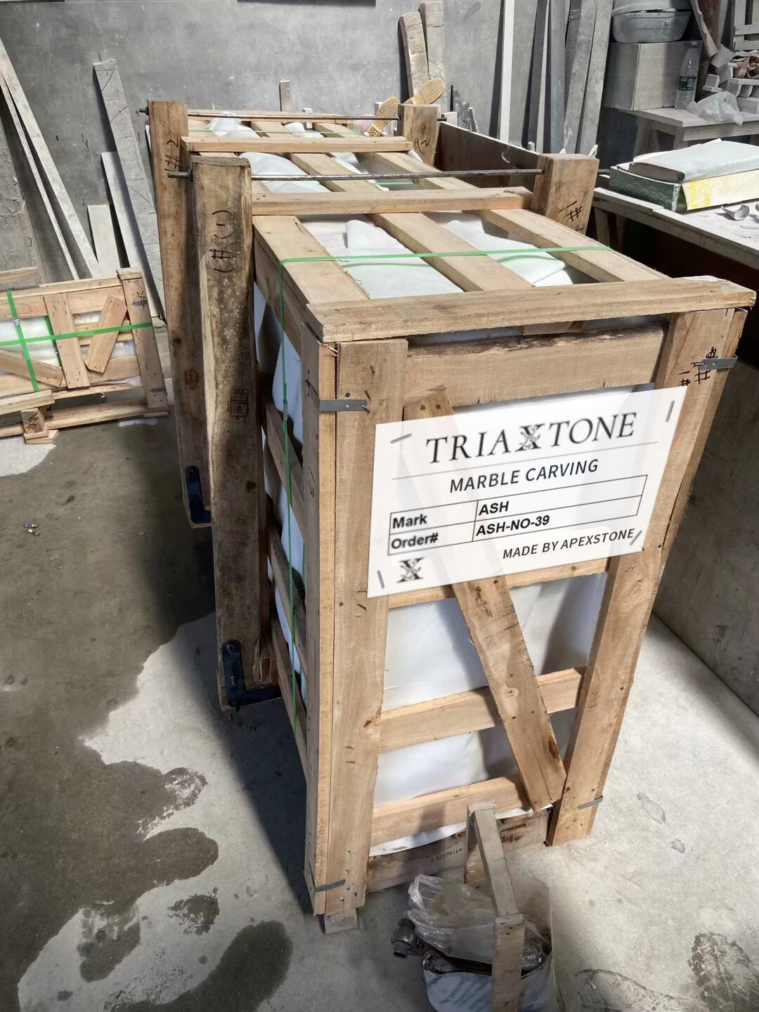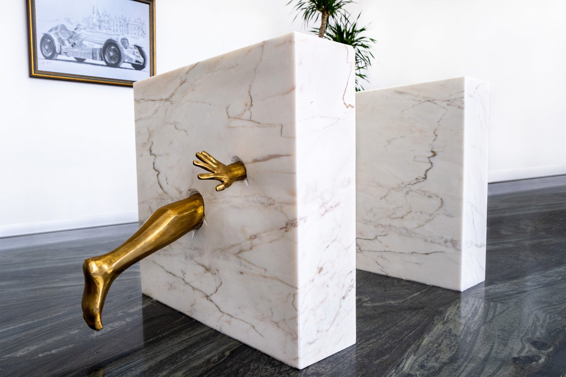 - Prized for its natural grey-white veining, The unique Carrara marble countertop is highly respected for its natural off-white texture, which is perfectly matched with the handmade brass runner.