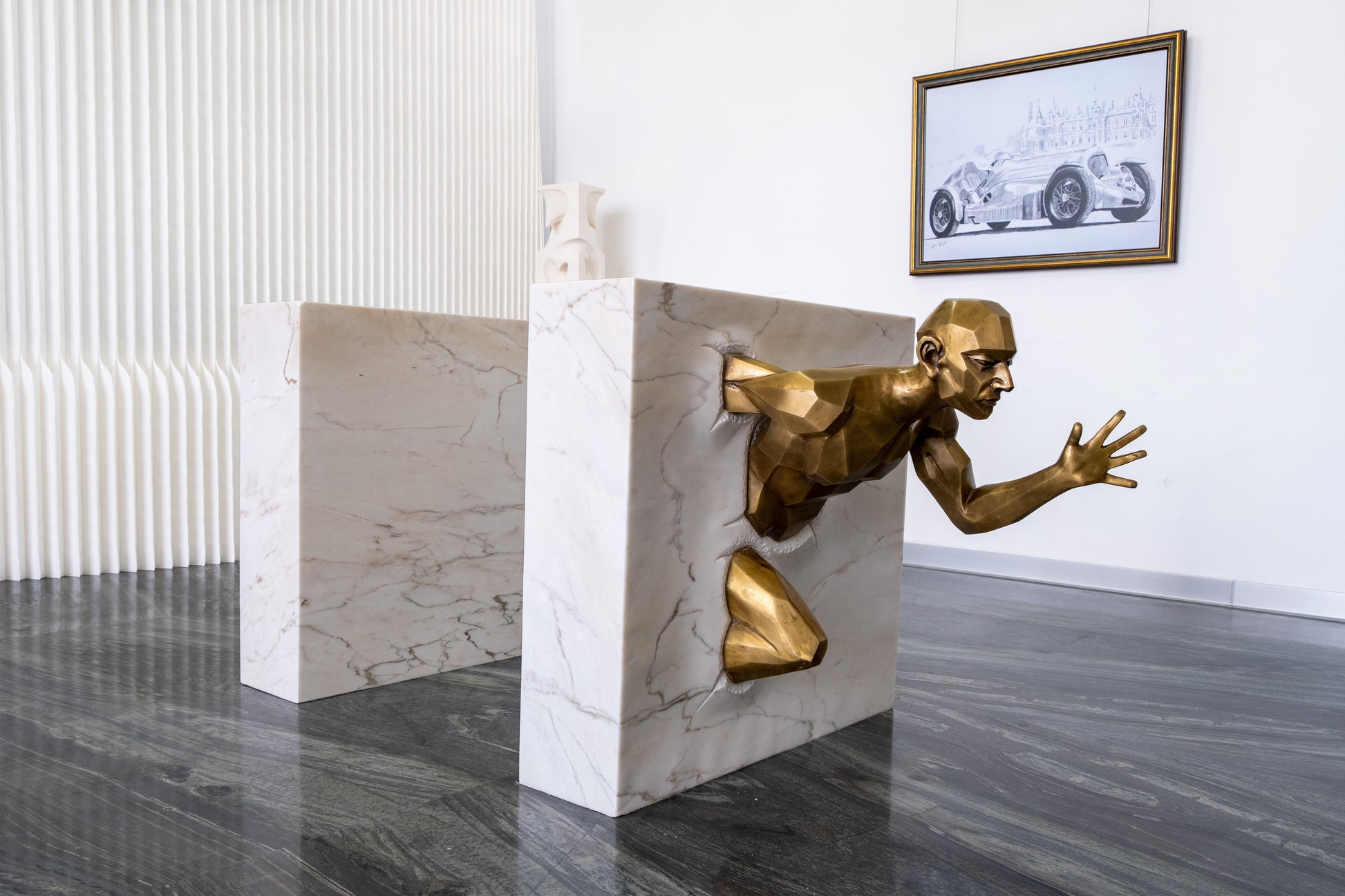 His torso and head burst forth from one block one whilst the other shows his flying leg and hand as he bursts through space.