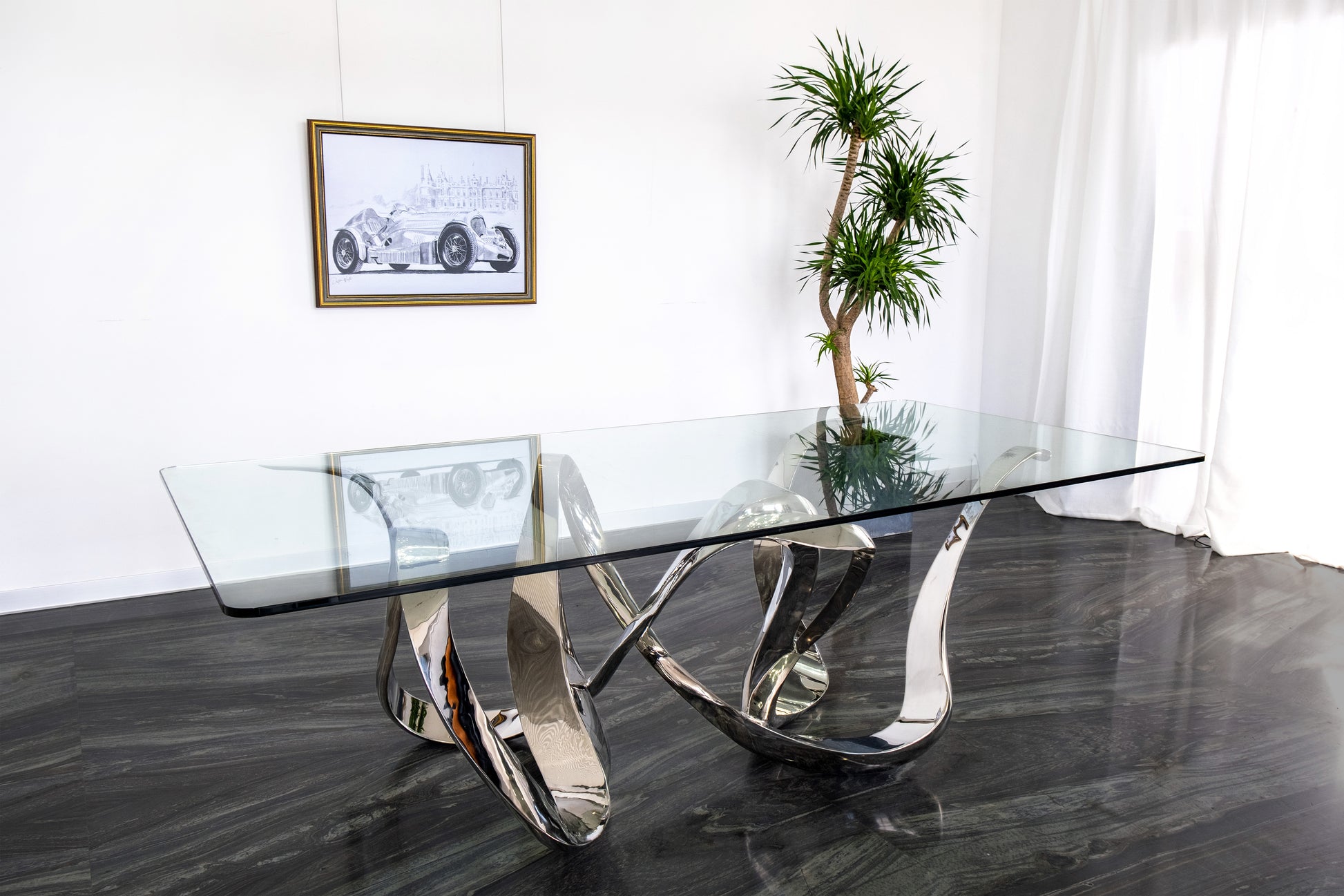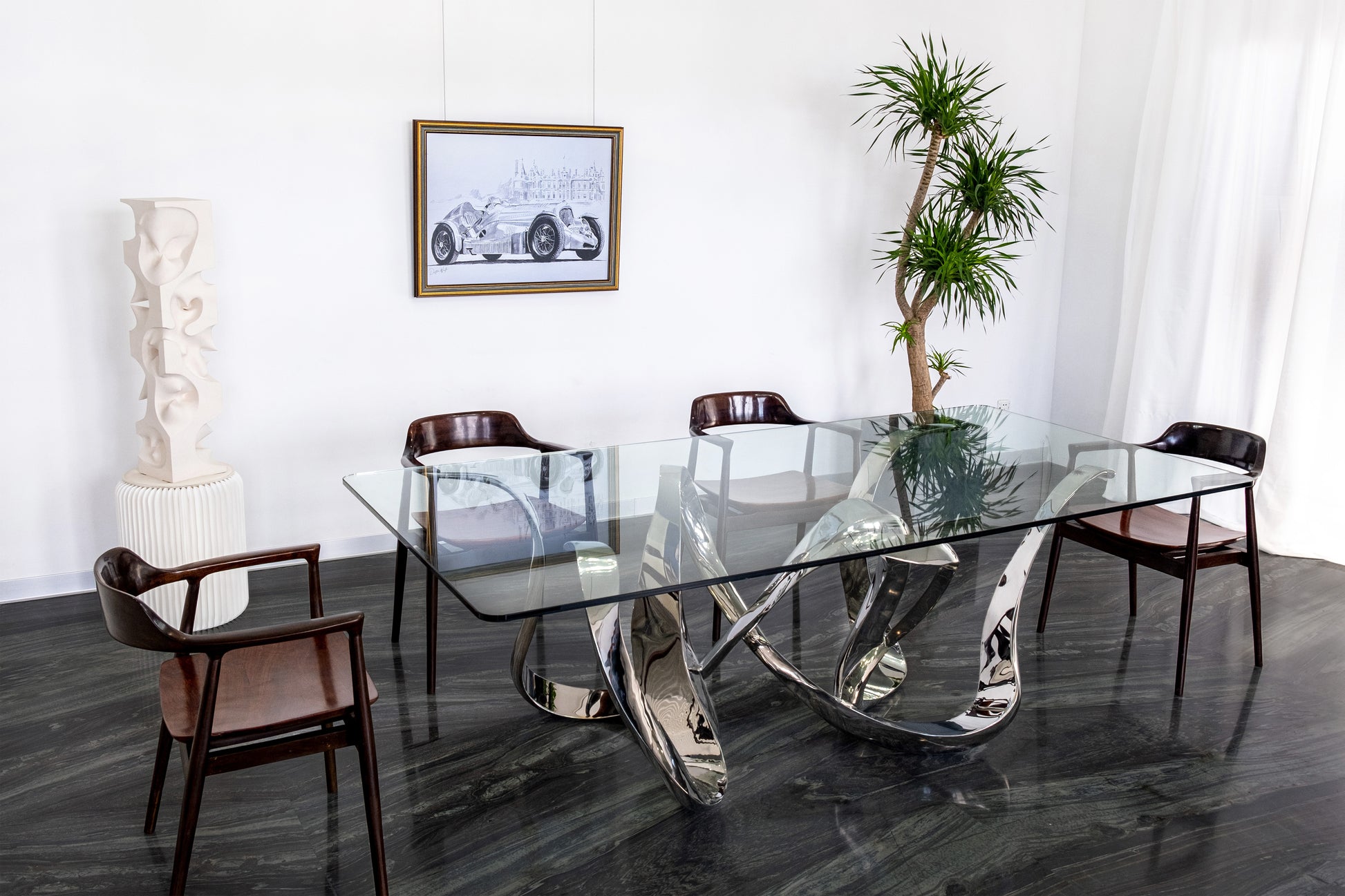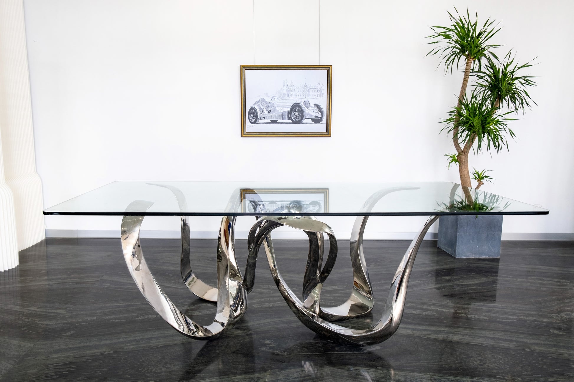 A table base that recreates the organic growth form of roots that cascade, turn, bend and flow; a stainless steel dining table base with its heritage in the past and its design in the future
