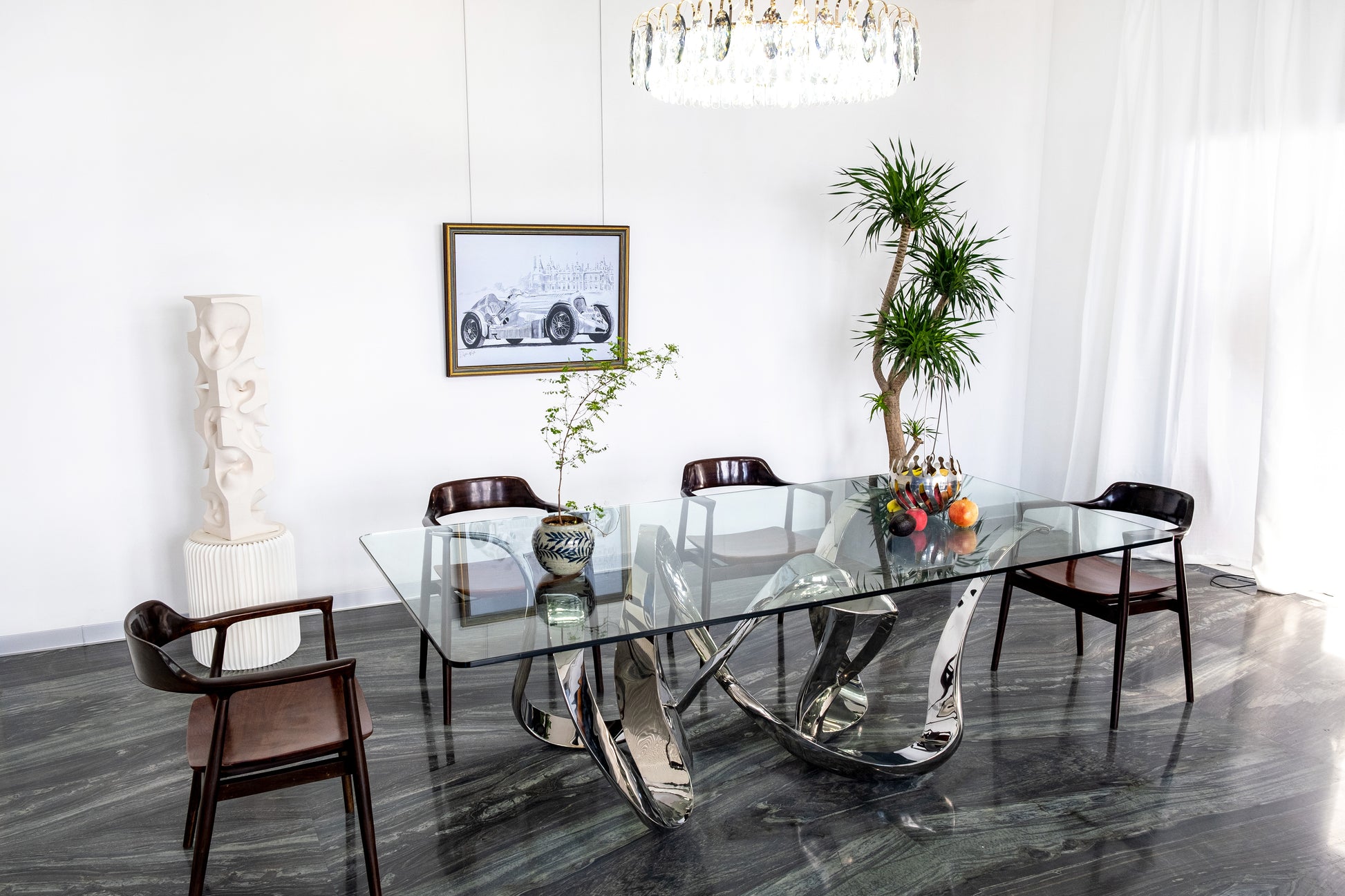 A stainless steel table base that emulates the growth of roots, cascading, bending, and flowing into one organic form, with its heritage in the past and its design in the future.